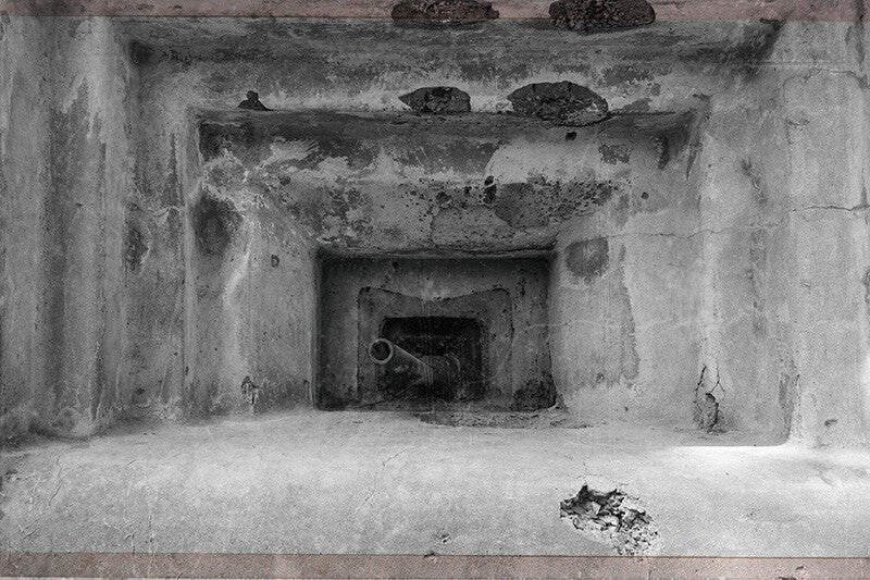 Fort Eben Emael (Bel), 3 x 75mm geschut. De Duitse zweefvliegers landden ongemerkt op het plateau en schakelden het geschut uit met een nieuw wapen, de 'holle lading'.